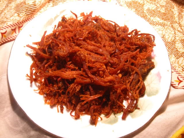 • Thịt sau khi xé xong bạn cho vào 1 cái chảo lớn, đặt lên bếp với lửa thật nhỏ, bạn đảo đều tay, khi miếng thịt khô lại, bạn thấy vừa là được (Nói nôm na là đem rang thịt cho khô hẳn).