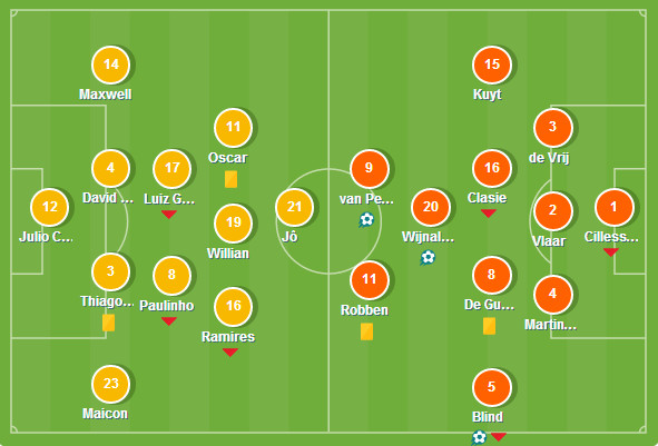 Trước trận đấu với Hà Lan, Brasil tỏ ra rất quyết tâm có được một chiến thắng nhằm chuộc lỗi với người hâm mộ. Tuy nhiên, thực tế trên sân lại diễn biến hoàn toàn trái ngược. Ngay phút thứ 2, pha phạm lỗi của trung vệ đội trưởng Silva với Robben trong vòng cấm đã khiến Brasil phải nhận bàn thua trên chấm 11m.