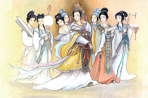 Thời Đường: Công cuộc tuyển chọn mỹ nữ ở thời Đường cũng không hề thua kém so với các triều đại trước đó. Vào năm Thiên Bảo, Đường Huyền Tông thậm chí còn công khai phái người cưỡng bắt mỹ nữ con dân thường và quan lại để tiến công. Viên quan chuyên đảm trách nhiệm vụ này được gọi là "Hoa điểu sử". Đường Huyền Tông hạ lệnh nếu nhà nào cố tình che giấu con gái, không tham gia tuyển chọn thì sẽ bị tử hình.