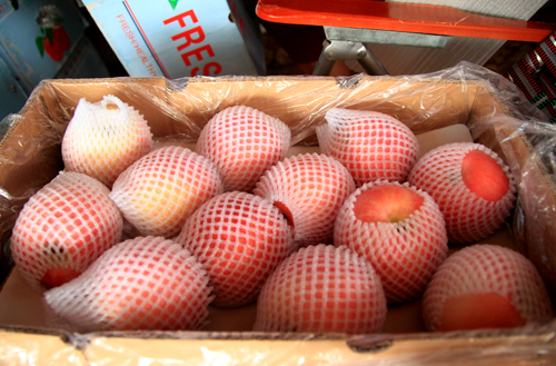 Một thùng táo đường Trung Quốc bọc vỏ xốp, chưa được dán tem. Ảnh: Phan Dương.