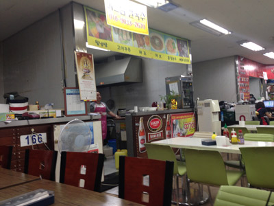 Quán nằm lẫn với một vài tiệm ăn Hàn Quốc cũng khá nhỏ khác, theo kiểu một “food court” chung. Bù lại, quán cũng khá gọn gàng với bàn ghế xếp ngay ngắn trước một quầy bếp khoảng ba bốn thước vuông.