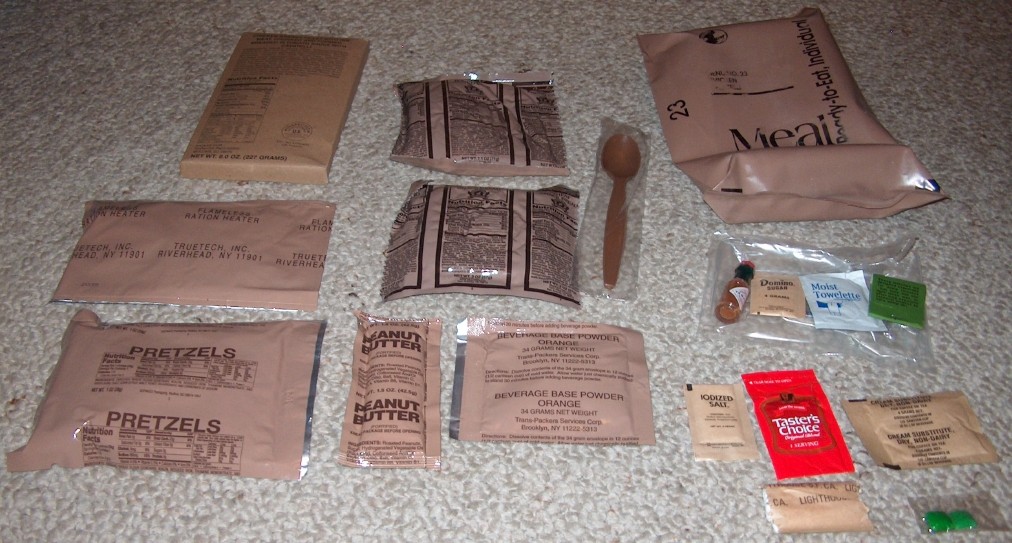 Mỗi MRE gồm món tráng miệng, bánh quy giòn, phô mai, bơ đậu phộng. Món ăn chính có thể là mỳ ống hoặc thịt bò hầm, bánh mì, một túi làm nóng thức ăn bằng cách đổ nước vào.