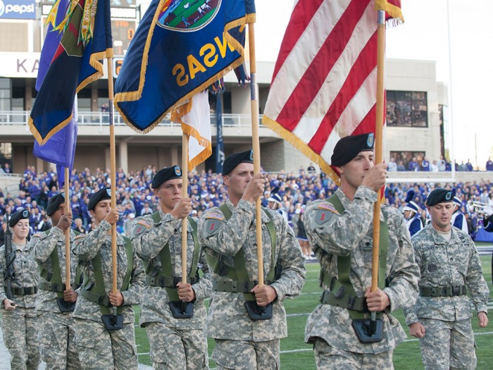 Lính Fort Riley trình bày màu sắc trước khi trận đấu bóng đá Texas Tech vào Thứ 7 Tháng 10 14, 2014 (Emily DeShazer | Các viên trường đại học)