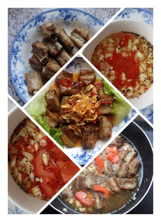 Chị chia sẻ công thức: “Sườn luộc sơ qua cho hết bọt bẩn. Đổ nước đem sườn đi rửa sạch. Sau đó đổ dầu vào chảo cắt 1 củ hành khô cho vào phi vàng thơm vớt hành ra. Cho sườn vào rán vàng và chín sườn, lát đun nước sốt cho thấm thôi chứ không phải lo sườn chưa chín nữa.