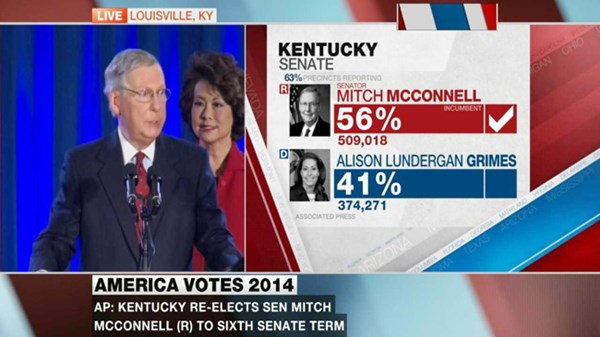Ông Mitch McConnell (đeo kính) đánh bại bà Alison Lundergan Grimes trong cuộc bầu cử giữa kỳ để trở thành lãnh đạo phe đa số tại Thượng viện Mỹ. Ảnh: AP