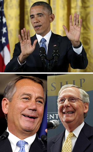 Tổng thống Dân chủ Barack Obama phải chịu hai năm giữa hai thủ lĩnh Cộng ḥa John Boehner (trái) và Mitch McConnell