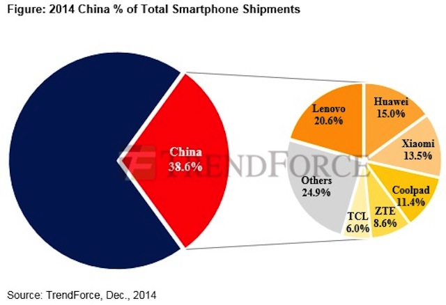 Hãy bắt đầu với các con số, tờ TrendForce của Đài Loan mới đây đã thống kê rằng vào cuối năm 2014 điện thoại Trung Quốc sẽ có hơn 450 triệu đơn vị xuất xưởng. Đây là một sự gia tăng 50% so với cùng kỳ năm trước, thậm chí còn ấn tượng hơn là việc các thiết bị đến từ quốc gia đông dân nhất thế giới này đang chiếm khoảng 38.6% tổng số điện thoại thông minh toàn cầu.