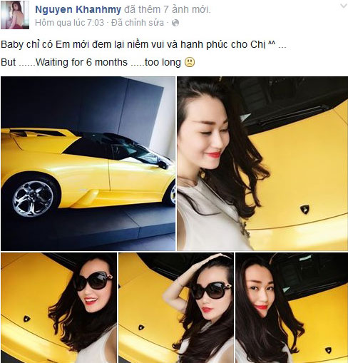Trên trang Facebook cá nhân, người mẫu Khánh My đã khoe đặt mua siêu xe Lamborghini Murcielago Roadster. Cô đã đăng ảnh chụp bên một chiếc Lamborghini Murcielago Roadster màu vàng và tự khoe: “Baby chỉ có em mới đem lại niềm vui và hạnh phúc cho chị. But waiting for 6 months… too long”. Qua đó, có thể đoán, cô nàng chân dài sẽ phải chờ khoảng 6 tháng trước khi nhận chiếc siêu xe Lamborghini Murcielago Roadster của mình.