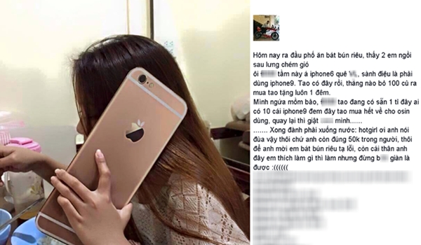 Một thanh niên ở Hà Nội kể chuyện về cô gái cầm ‘iPhone 9’ này như sau: Hôm nay ra đầu phố ăn bát bún riêu, thấy 2 em ngồi sau lưng "chém gió". Một em lên tiếng: "Ôi tầm này á, iPhone 6 quê lắm, sành điệu là phải dùng iPhone 9. Tao có đây rồi, thằng nào bỏ ra 100 củ (100 triệu) ra mua, tao tặng luôn 1 đêm".