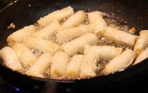 Chiên chả giò: chiên làm 2 lần. Lần 1 chỉ chiên sơ cho chả giò vừa chín và vỏ ngoài còn trắng. Khi gần ăn mới thả chả giò vào chiên lại lần 2 với lửa nhỏ cho chả giò vàng. Chiên chả giò theo từng mẻ, vớt hết chả giò ra mới thả mẻ khác vào, nhiệt độ dầu mới giữ ổn định và chả giò mới giòn.