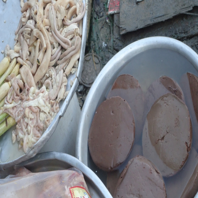 Không chỉ vận chuyển, bất cứ ai khi chứng kiến môi trường sản xuất thực phẩm được đặt bên cạnh nhà vệ sinh tại một cơ sở sản xuất trên địa bàn huyện Bình Chánh đều thấy ám ảnh. Theo đó, vào ngày 1/8/2014, đoàn kiểm tra liên ngành huyện Bình Chánh do trạm Thú y huyện Bình Chánh chủ trì, bất ngờ kiểm tra cơ sở sơ chế phụ phẩm heo tại địa chỉ 174B/6B ấp 2 (xã An Phú Tây) do ông Nguyễn Quốc Việt làm chủ. Trong quá trình kiểm tra, đoàn phát hiện cơ sở đang sơ chế sản phẩm huyết heo không rõ nguồn gốc, không giấy chứng nhận kiểm dịch sản phẩm động vật. Sản phẩm sau khi sơ chế để trên sàn nhà cạnh nhà vệ sinh. Đặc biệt, số huyết heo đã tồn trữ lâu ngày tại cơ sở có biểu hiện ngả màu, biến chất...