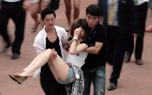 Một fan nữ bị đau, được hai fan nam bế sau khi bị xô đẩy trong đám đông.