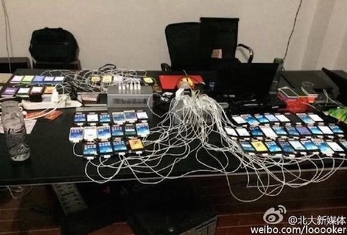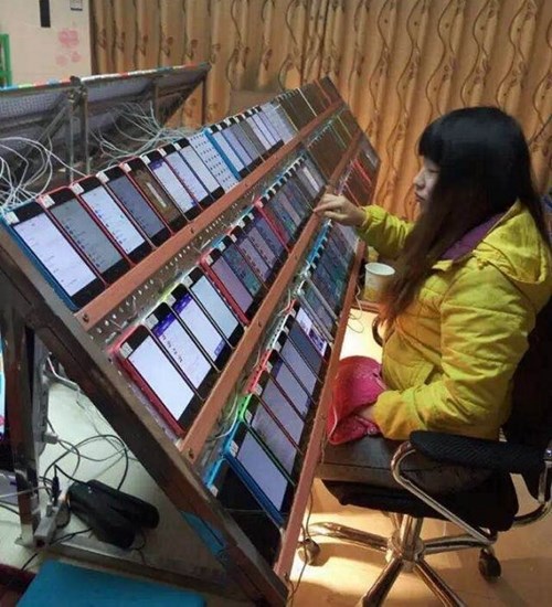 Họ đã dùng rất nhiệu loại iphone rẻ tiền kết nối mạng và tải liên tục các ứng dụng theo đơn đặt hàng. Sau đây là một ảnh trong xưởng "thăng hạng ứng dụng Apple Store"