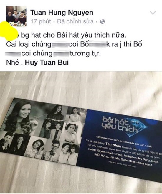 Vietbf.com - Ca sĩ Tuấn Hưng đã làm thầy người ta mà cư xử thế thì dạy dỗ sao đây. vì trước những chỉ trích nặng nề về chương trình Bài hát yêu thích và nhạc sĩ Huy Tuấn cũng như cuộc "khẩu chiến" mới nhất với ca sĩ Mỹ Linh, khán giả Việt đã để lại nhiều ý kiến trái chiều dành cho tân huấn luyện viên The Voice này. Tuấn Hưng đã bất ngờ lên trang cá nhân đăng tải trạng thái bức xúc, sử dụng những lời văng tục khá nặng nề và đánh dấu trực tiếp nhạc sĩ Huy Tuấn – giám đốc âm nhạc của Bài hát yêu thích, kèm theo là bức ảnh chụp vé mời của chương trình. Nhìn vào có thể dễ dàng nhận ra Tuấn Hưng không hài lòng vì tên mình bị xếp sau nhiều ca sĩ trẻ và ảnh của anh cũng chỉ có kích thước nhỏ bằng các ca sĩ đàn em, và hãy tham khảo bài báo về Tuấn Hưng sau đây.