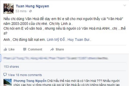 Tuấn Hưng dẫn những đoạn viết và bình luận của khán giả có thâm ý chê bai về Mỹ Linh. Sau đó, anh tiếp tục đăng tải lời "khiêu chiến" với Mỹ Linh, NS Huy Tuấn khi viết rằng sẽ chia sẻ những chuyện đã xảy ra cách đây khoảng 10 năm để khán giả biết rõ hơn về Mỹ Linh khi đã chê anh "vô văn hóa".