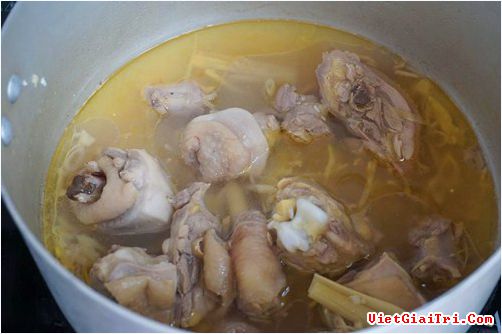 Bước 2: Gà chín săn lại thì đổ 1 tô nước vào nồi. Nước sôi thì vặn nhỏ lửa rồi ninh đến khi gà mềm là được.