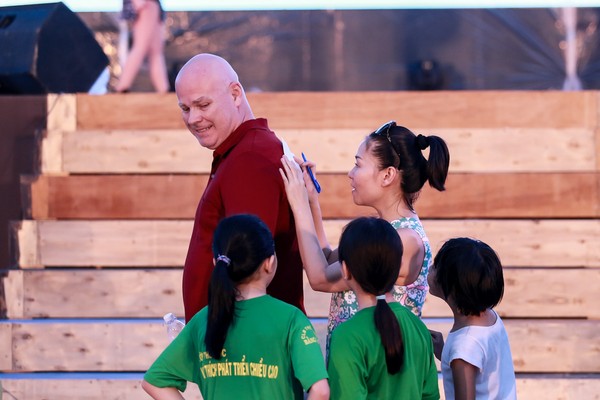 Sau buổi tập, bà mẹ một con cũng tranh thủ nán lại để trò chuyện cùng các fan nhí. Thu Minh còn mượn bờ vai của chồng làm điểm tựa để ký tặng fan một cách đáng yêu.
