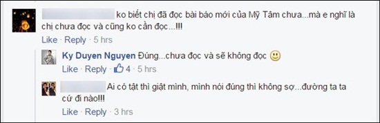 Bằng việc trả lời một trong những b́nh luận trên facebook với câu nói: "Đúng… chưa đọc và sẽ không đọc", MC Kỳ Duyên đă cho thấy thái độ không quan tâm tới dư luận