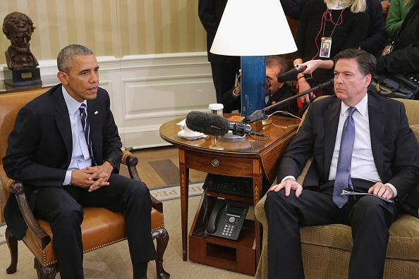 Tổng Thống Obama trong buổi họp báo cùng với ban an ninh quốc gia mà trong đó có Giám Đốc FBI James Comey (bên phải) tường trình về vụ bắn tại San Bernardino tại Tòa Bạch Ốc. (Chip Somodevilla/ Getty Images)