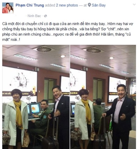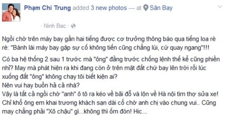 Sau đó, ban an ninh sân bay đã hoãn chuyến bay để kiểm tra. Sau 3 tiếng ngồi chờ, Chí Trung và vợ quyết định hoãn lịch vào TP HCM thăm người em thân thiết mới khai trương khách sạn.
