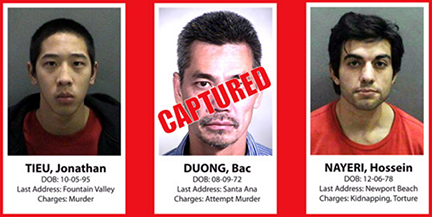 Một người đã bị bắt, hai người còn bị truy nã và có thể đã di chuyển lên San Jose hoặc Fresno. (O.C. Sheriffs Dept.)
