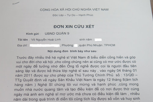 Hiện tôi đang thực hiện ước mơ xây dựng nhà tổ sân khấu tại phường Long Phước với mục đích có chỗ ổn định thờ cúng ông tổ. Công trình này là nhà gỗ, không xây đúc kiên cố và cũng phù hợp với điều kiện sinh thái ở địa phương. Tôi mong muốn UBND quận 9 xem xét cho được tồn tại công trình này để phục vụ cho nghệ sĩ”.
