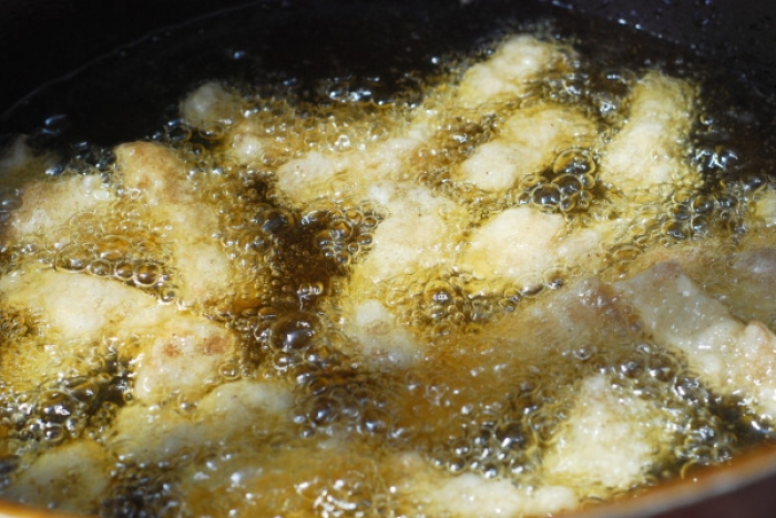 Bước 4: Chuẩn bị chảo sâu lòng, cho chảo lên bếp, đợi chảo nóng thì cho dầu ăn vào chảo (lượng dầu tương đối nhiều để đảm bảo miếng thịt được chiên ngập dầu mới vàng đều và đẹp mắt).