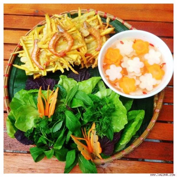 Xếp bánh tôm chiên khoai lang ra đĩa, ăn kèm với nước chấm chua ngọt và rau sống theo mùa. Bánh tôm thơm lừng và giòn rụm sẽ kích thích vị giác khiến cả gia đình thích thú.