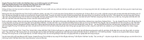 Vietbf.com - Cùng với Lý Nhã Kỳ, Angela Phương Trinh đã có màn xuất hiện đáng chú ý tại LHP Cannes, khi Angela Phương Trinh xuất hiện trên thảm đỏ LHP Cannes trong lễ ra mắt bộ phim "Julieta". Tuy nhiên, sự xuất hiện này đang được nhắc đến là "điều chưa từng xảy ra với một diễn viên Việt Nam" hay nói rằng Angela Phương Trinh đã nhận được sự ưu ái dành cho sao lớn từ BTC LHP Cannes.