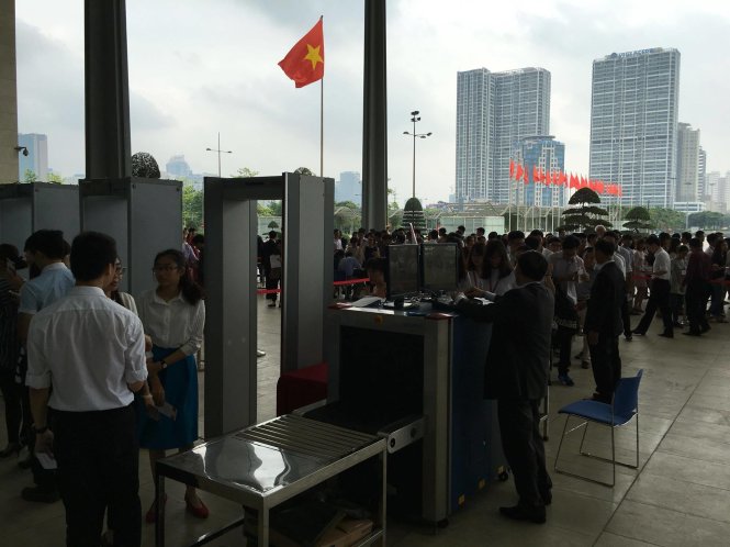 Tất cả đều được kiểm tra an ninh chặt chẽ khi vào trong trung tâm hội nghị quốc gia Mỹ Đình - Ảnh: QUỲNH TRUNG