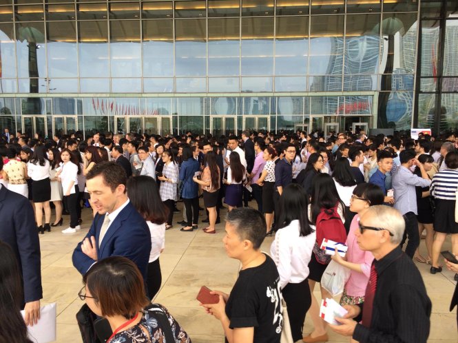 Hàng ngàn người xếp hành chờ kiểm tra an ninh vào Trung tâm Hội nghị Quốc gia Mỹ Đình sáng 24-5 - ẢNH: QUỲNH TRUNG