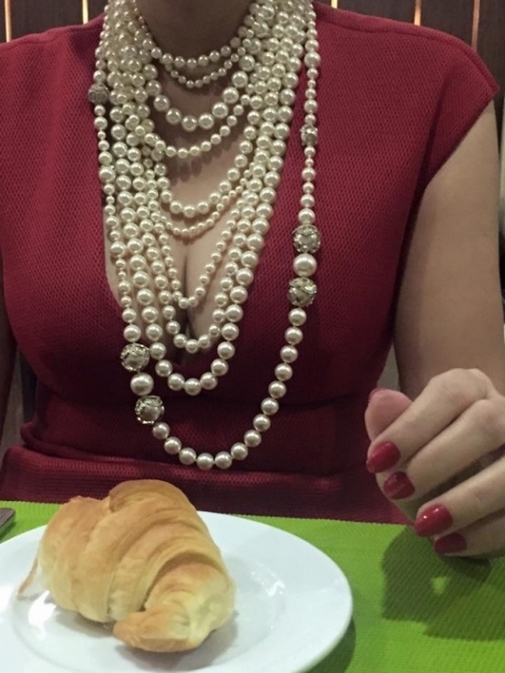 Cận cảnh đôi gò bồng lấp ló phía sau chuỗi ngọc trai của Diễm My