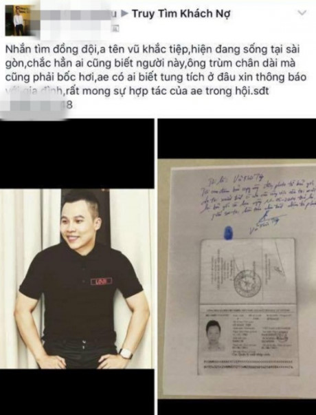“Nhắn tìm đồng đội, anh tên Vũ Khắc Tiệp, hiện sống tại Sài Gòn. Chắc hẳn ai cũng biết người này, ông trùm chân dài mà cũng phải bốc hơi. Anh em có ai biết tung tích ở đâu xin thông báo với gia đình. Rất mong sự hợp tác của anh em trong hội”, người này viết. Kèm theo dòng chia sẻ là một bức thư tay được cho là của Vũ Khắc Tiệp viết khi hỏi mượn tiền.