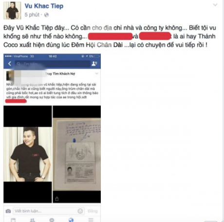 Cách đây vài tiếng, một tài khoản facebook ẩn danh đã lên tiếng tố cáo Vũ Khắc Tiệp nợ tiền không trả. Người này còn đăng tải thông tin về hình ảnh và hộ chiếu cầm cố được cho là của Khắc Tiệp trên trang này. Thậm chí, người này còn để lại số điện thoại để bất kỳ ai có thông tin có thể cung cấp.
