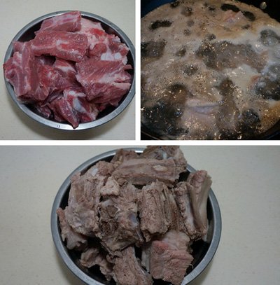 Sườn rửa sạch, cắt miếng vừa ăn. Đun nồi nước sôi, cho sườn vào luộc rồi vớt ra để ráo nước.