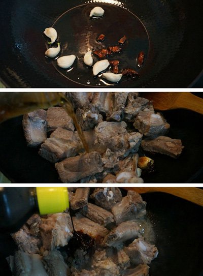 Bạn làm nóng chảo dầu trên bếp, cho tỏi, hoa hồi vào phi thơm. Tiếp theo cho sườn vào xào một phút đổ rượu vang vào, thêm nước xốt teriyaki, một ít muối.