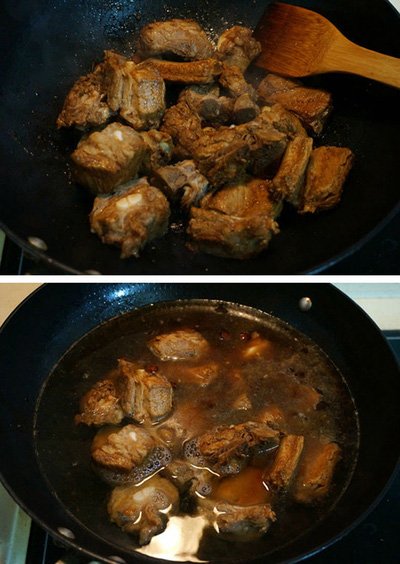 Đảo đều cho sườn thấm gia vị, đổ nước nóng vào ngập miếng sườn là được, đậy nắp đun nhỏ lửa.