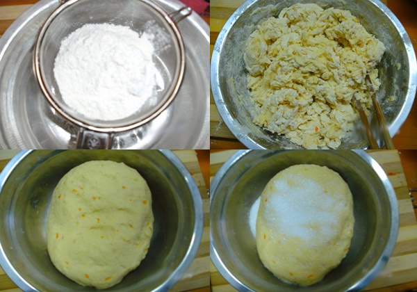 + Đổ vỏ cam vừa nạo vào bát đựng bột, thêm dầu thực vật và men hòa nước vào rồi dùng đũa đảo đều đến khi các nguyên liệu hòa quyện với nhau tạo thành khối bột mềm, dẻo.