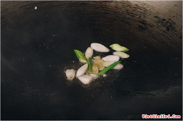 Bước 3: Thêm gừng vào chảo, để khoảng 20 giây, thêm 1 muỗng canh dầu nếu cần thiết. Sau đó, cho tỏi băm, phần trắng của hành lá vào, xào thêm 10 giây rồi cho rượu nấu ăn vào.