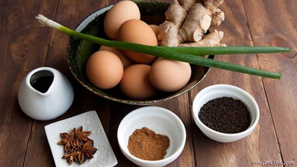 - Cho trứng đã được đập nứt vỏ vào trong nồi, lần lượt cho hoa hồi, gừng, hành lá, xì dầu, ngũ vị hương, trà đen vào. Sau đó đem đun dưới lửa nhỏ liu riu như khi kho thịt khoảng một tiếng là được.