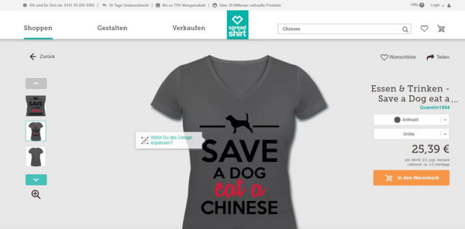 Theo hãng tin AP, các sản phẩm của nhà bán lẻ Spreadshirt.de gây bức xúc với đại sứ quán Trung Quốc tại berlin là những chiếc áo thun có in những khẩu hiệu "Cứu một con chó, Ăn một người Trung Quốc", "Cứu một con cá mập, Ăn một người Trung Quốc", và hình ảnh mô phỏng hai ký tự alphabet của Trung Quốc đang làm tình và dòng chú thích "Bây giờ thì tôi hiểu người Trung Quốc".