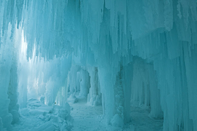 Mặt trời lúc hoàng hôn chiếu vào các nhũ băng trong động băng trên hồ Baikal ở Nga tạo nên khung cảnh ấm áp. Hành trình tới khu vực này rất nguy hiểm, khi nhiều du khách bị tụt xuống dưới lớp băng trên hồ.