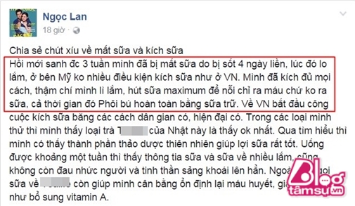 Tưởng được chồng chăm sóc và sinh đẻ ở nơi có điều kiện tốt nhất thì Ngọc Lan đỡ vất vả nhưng không ngờ cô cũng có những khó khăn riêng. Rất nhiều lần Ngọc Lan nói về việc mình bị mất sữa khi mới sinh và khi biết rõ tình trạng của cô lúc đó thì không khỏi khâm phục