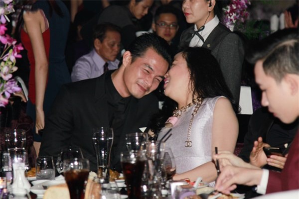 Đáng chú ý, tại bàn tiệc của mình, Phượng Chanel đã thoải mái choàng tay qua cổ Quách Ngọc Ngoan. Đáp lại tình cảm của “người tình tin đồn”, nam diễn viên cũng mỉm cười nghiêng đầu nhẹ về phía Phượng Chanel và nhẹ nhàng cầm tay cô.