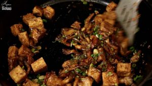 4. Cho nước sốt gia vị vào chảo đậu hũ + nấm. Khuấy đều trong vài phút. Vặn nhỏ lửa. Cho hành lá vào. Khuấy thêm lần nữa trước khi tắt bếp.