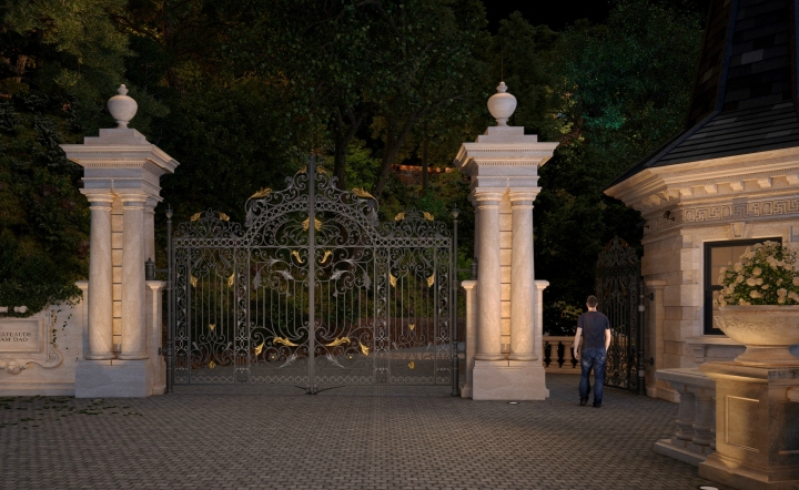 Không gian được thiết kế cơ động cho các buổi dạ tiệc, các sự kiện hay buổi hòa nhạc nhỏ, phần lớn mặt sân lát đá xám và để trống, bao quanh là những vòm cửa ốp đá marble màu beige, tượng sử dụng không nhiều nhưng được lựa chọn cực kỳ cẩn thận: