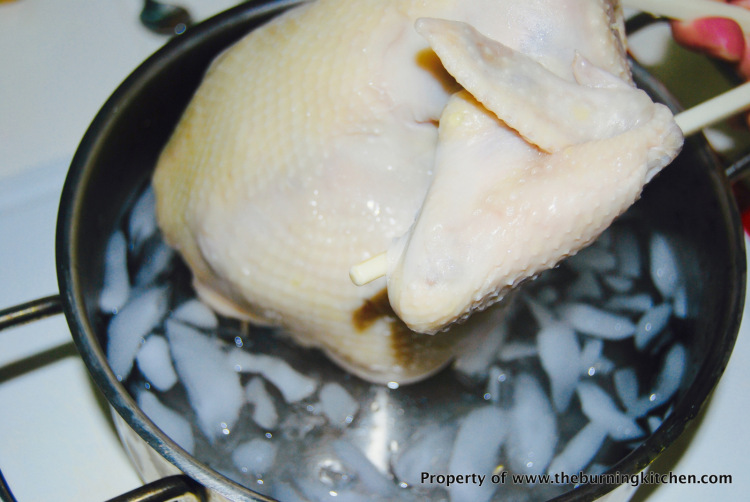 Khi thịt gà đă chín, dùng đũa nhấc gà lên từ dưới cánh và nhúng gà vào nước đá trong khoảng 20 phút để da gà gịn và thịt gà không bị nát.