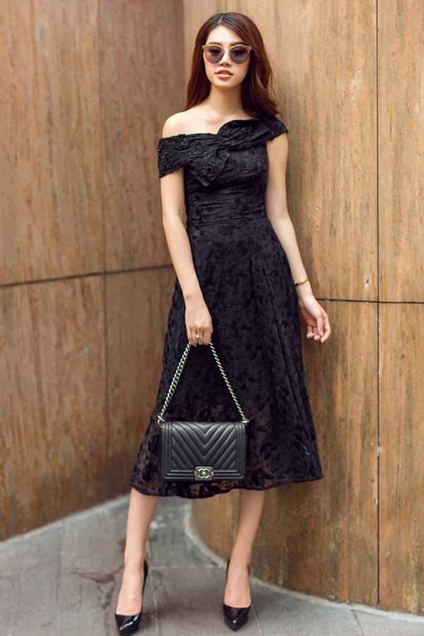 Với những cô nàng ưa chuộng phong cách điệu đà, một chiếc váy xoè cổ điển chắc chắn không thể thiếu trong tủ quần áo của mùa mốt này. Jolie Nguyễn áp dụng công thức phối tông xuyệt tông giữa trang phục và phụ kiện khi xuống phố với sắc đen trầm mặc nhưng sang trọng, cá tính. Trang phục được tạo điểm nhấn bằng chi tiết nơ bắt chéo nơi phần ngực tạo thành cấu trúc trễ vai gợi cảm.