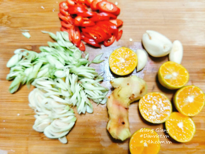- Bước 2: Riềng cạo sạch vỏ rồi thái miếng nhỏ, tỏi bóc vỏ, ớt sừng thái miếng vát mỏng, sả bào mỏng, quất cắt đôi bỏ hạt rồi vắt lấy nước cốt.