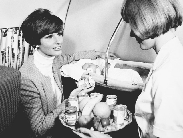 Hình ảnh một người phụ nữ với em bé của mình trong chuyến bay năm 1968 đang yêu cầu tiếp viên mang đến cho mình một lọ thức ăn dành cho trẻ em. Đây cũng là năm mà hãng hàng không Scandinavian Airlines bắt đầu mở thêm dịch vụ cho khách hàng là trẻ em.
